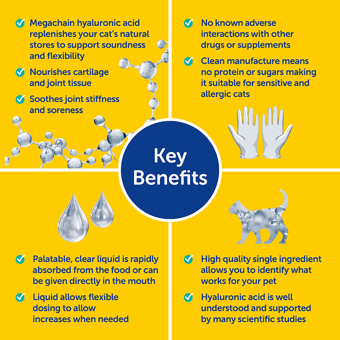 - Helps restore your cat's natural hyaluronic acid levels, crucial for joint lubrication.