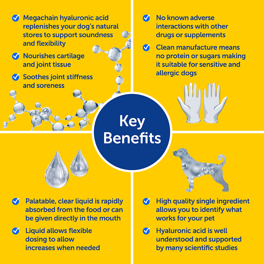 • Helps restore your dog's natural hyaluronic acid levels, crucial for joint lubrication.